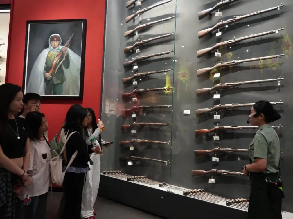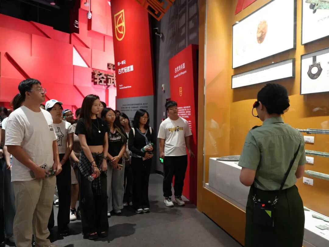 活动中,学员们先在工作人员引导下走进轻武器馆。馆内陈列着从早期步枪、冲锋枪到现代手枪、狙击步枪等各类轻武器,每件展品都承载厚重历史。工作人员结合历史背景,讲解武器研发历程、性能特点及战役应用,同学们认真聆听、驻足观察并记录,眼神满是对革命先辈的敬佩,部分同学还在指导下近距离感受武器构造,切身体会我国军事装备从落后到先进的跨越历程,深刻认识到国家强盛背后的奋斗与付出。