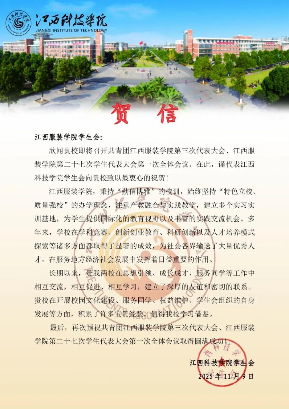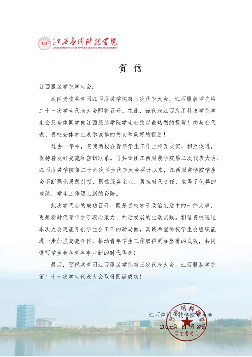 江西科技学院学生会向我校发来贺信