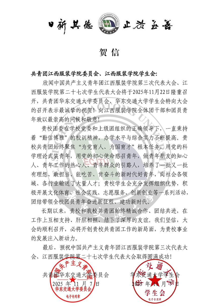 共青团华东交通大学委员会向我校发来贺信