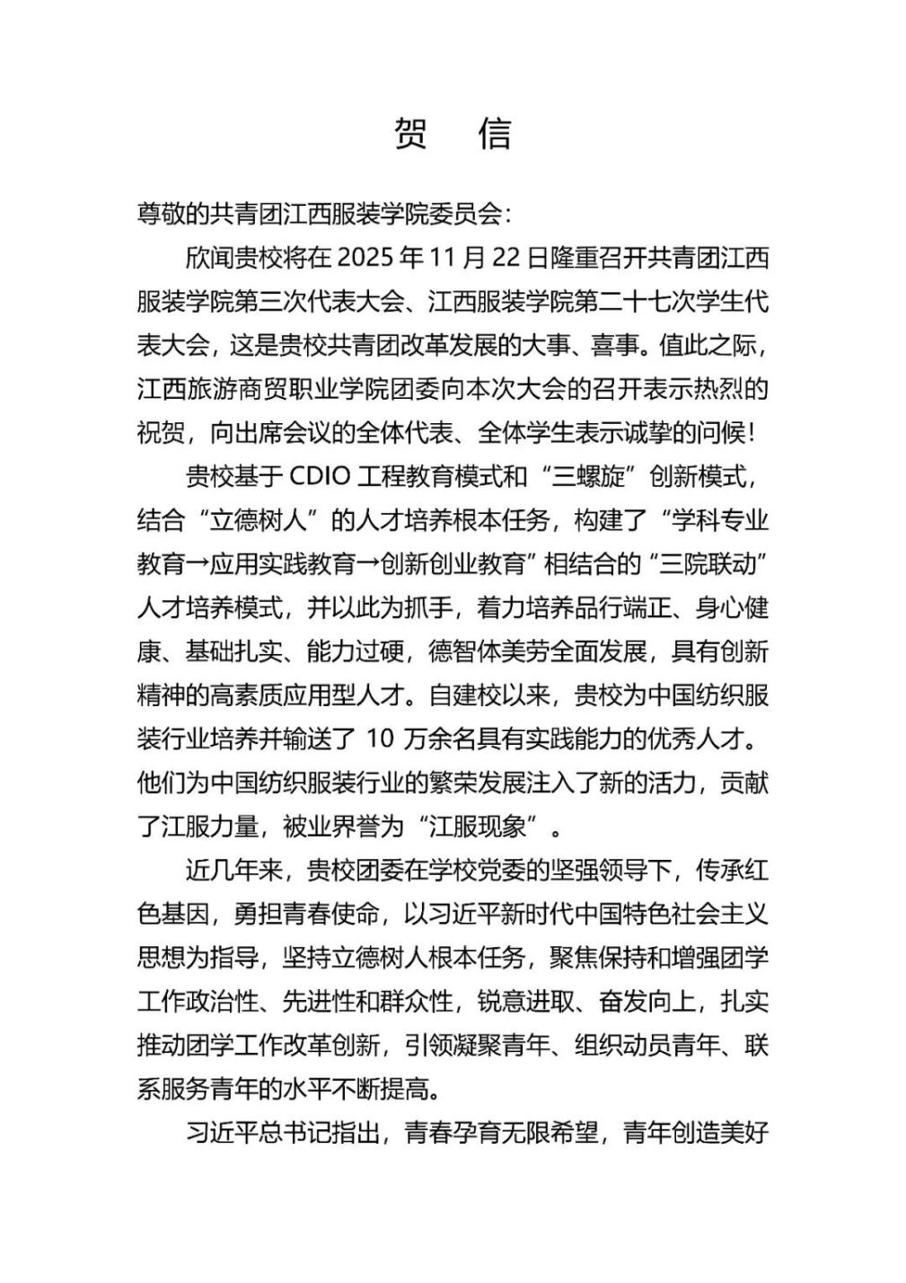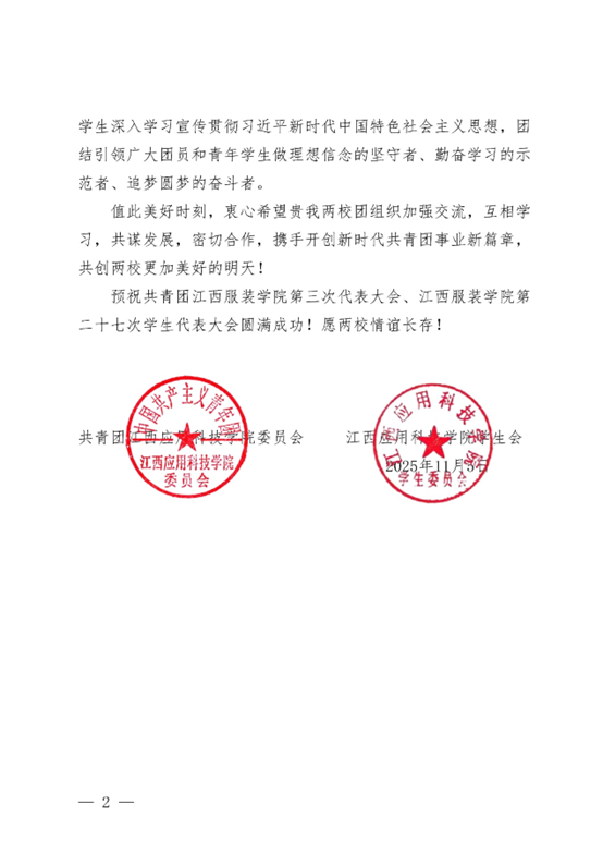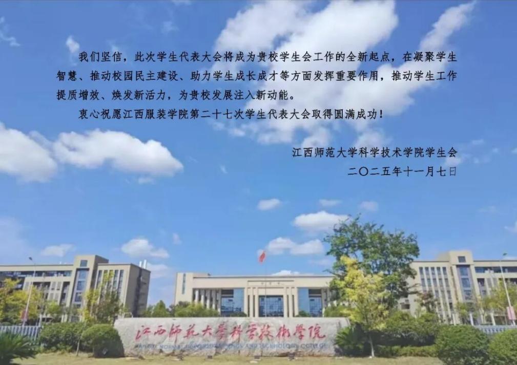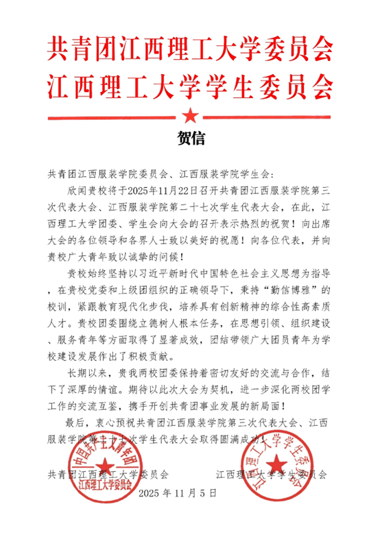 中国共产主义青年团江西服装学院第三次代表大会,江西服装学院第二十七次学生代表大会于11月22日召开。兄弟高校:哈尔滨理工大学、山东师范大学、西安建筑科技大学、河北传媒学院、吉林艺术学院、新疆职业技术大学、南昌大学、南昌航空大学、江西中医药大学、井冈山大学、华东交通大学、九江学院、豫章师范学院、江西理工大学、东华理工大学、赣东学院、赣南师范大学、南昌师范学院、景德镇陶瓷大学、江西科技学院、江西师范大学科学技术学院、江西水利职业学院、江西司法警官职业学院、江西应用科技学院、江西旅游商贸职业学院、江西环境工程职业学院、江西水利电力大学等高校对我校团学代会召开致以诚挚祝贺!让我们同向同行,引领广大团员青年在中国式现代化建设的征程中踔厉奋发、勇毅前行,共同书写时代华章!