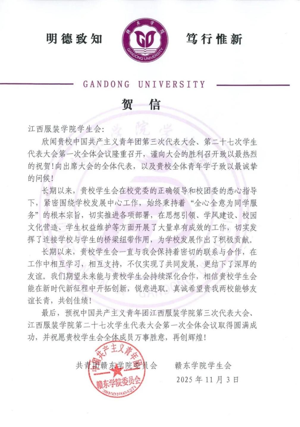 团旗迎风贺声传情,兄弟高校的贺信一封封抵达,字里行间藏着对青春的期待与诚挚祝福,这场为青春而启的盛会,正以最热烈的姿态,拥抱每一份心意,谨向各兄弟高校团组织,对我校团学代会的深情祝贺以表诚挚感谢,共青团江西服装学院第三次代表大会,江西服装学院第二十七次学生代表大会,倒计时2天