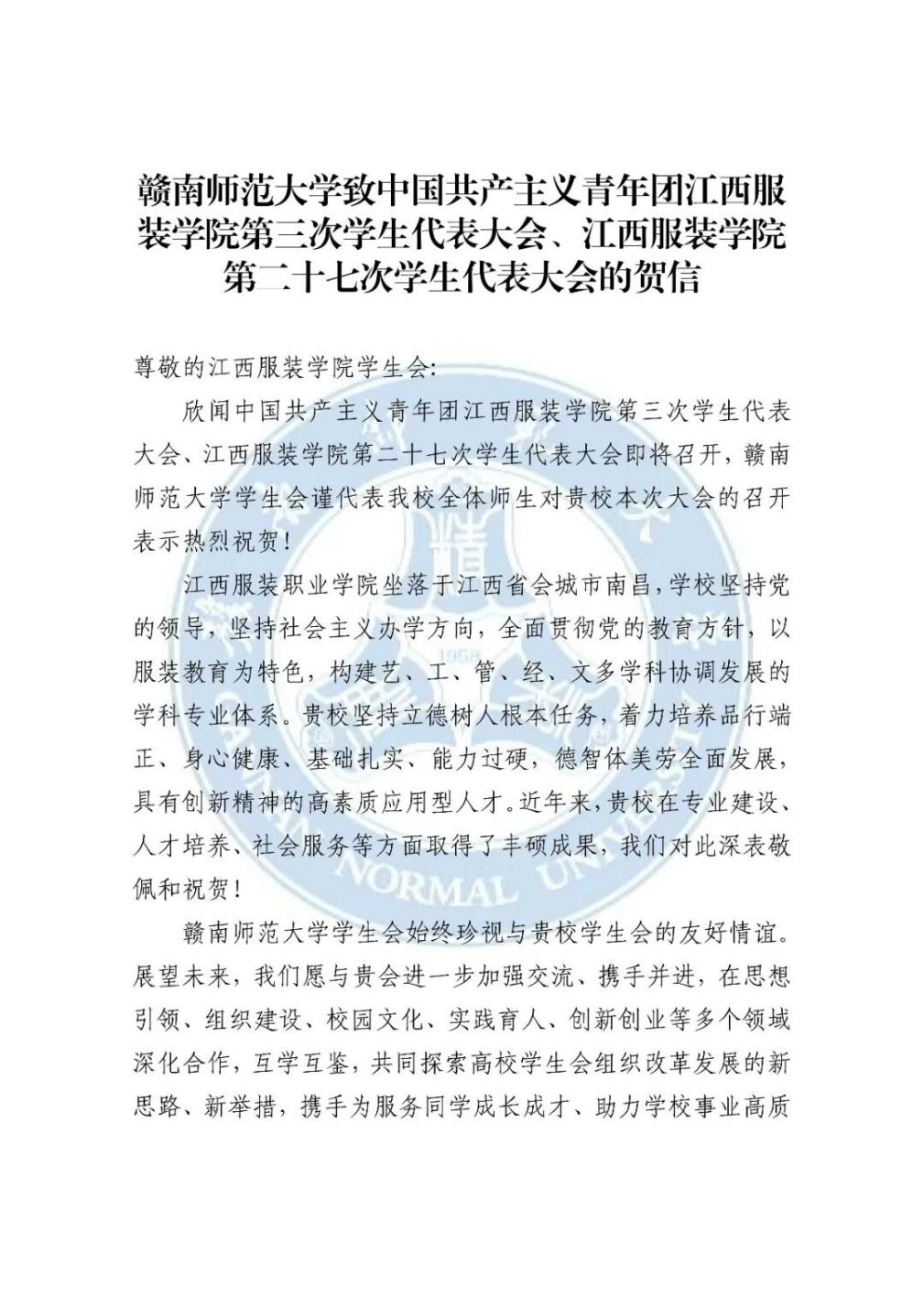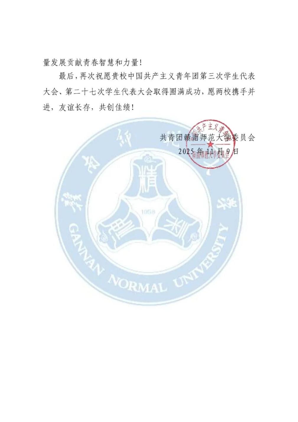共青团赣南师范大学委员会向我校发来贺信
