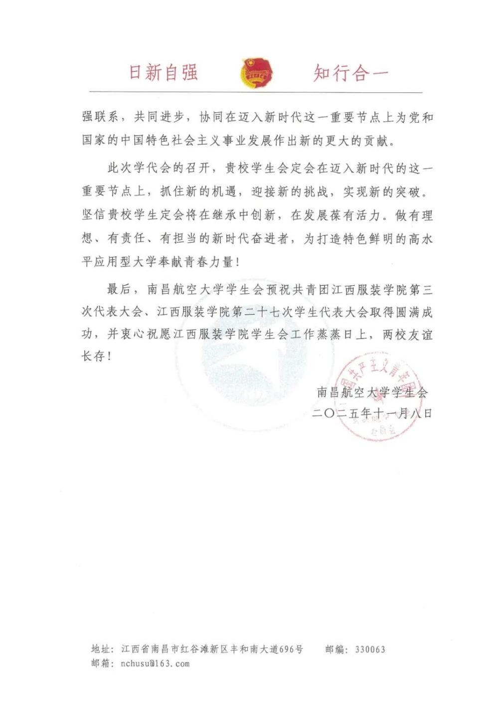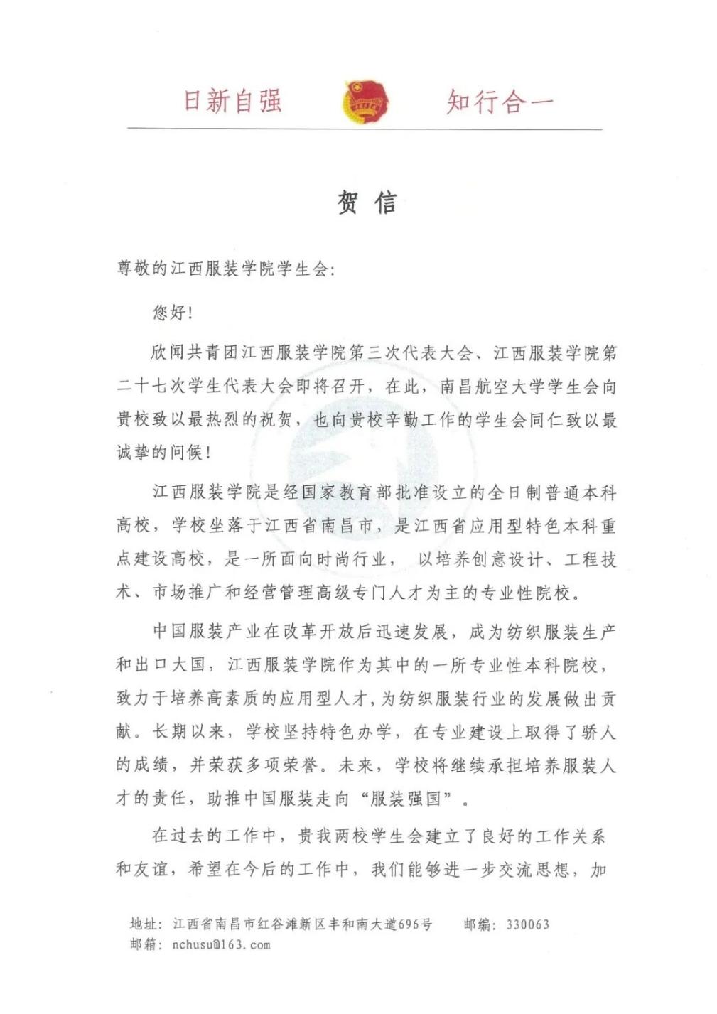 南昌航空大学学生会向我校发来贺信