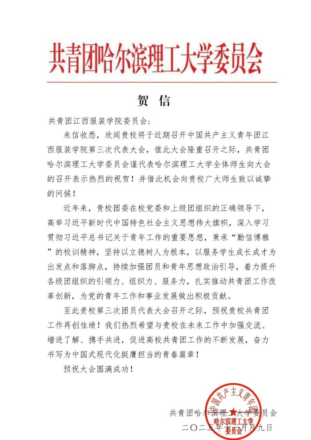 共青团哈尔滨理工大学委员会向我校发来贺信