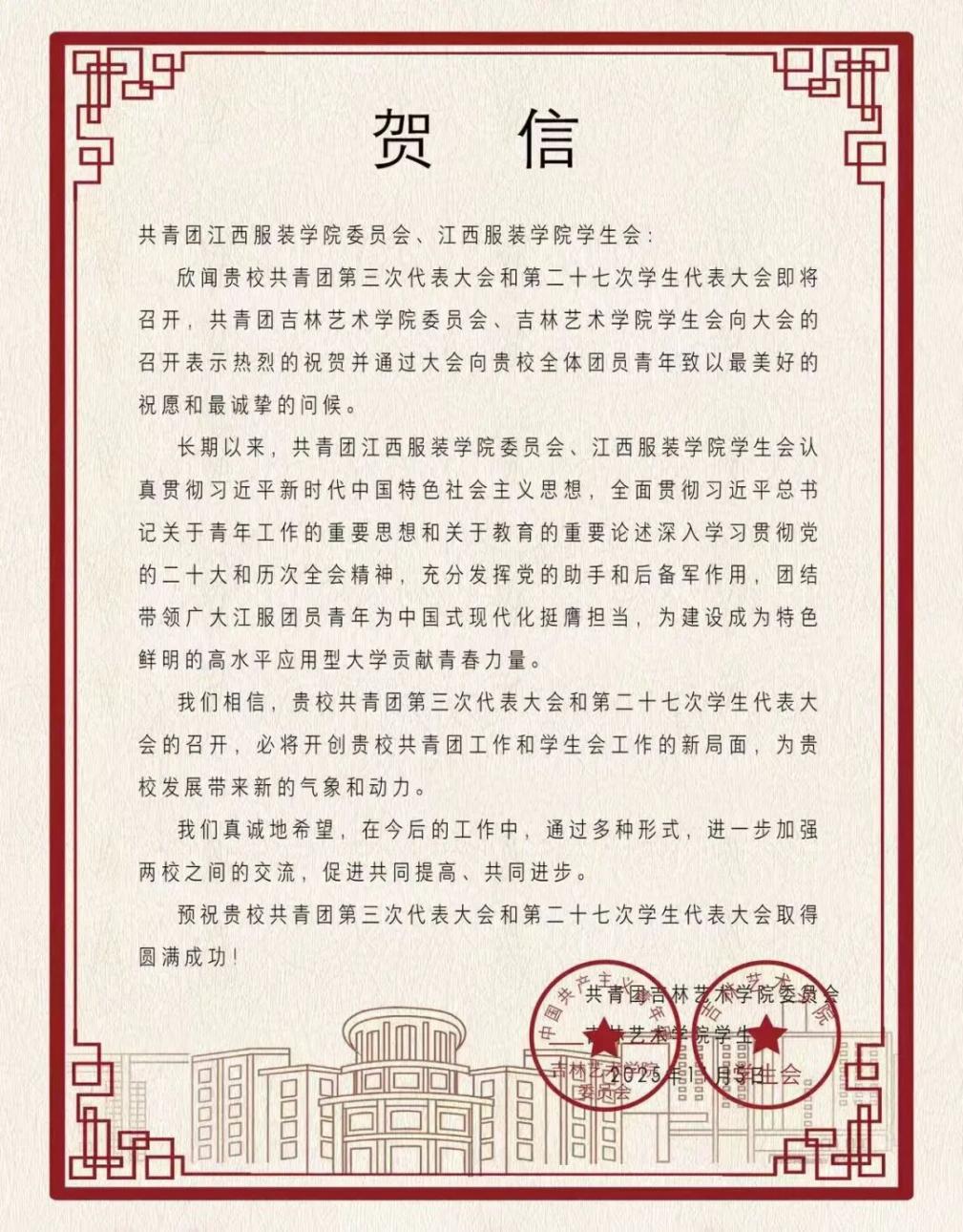 共青团吉林艺术学院委员会向我校发来贺信