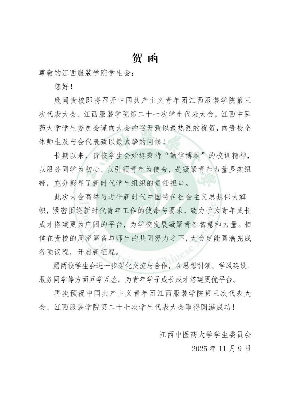 江西中医药大学学生会向我校发来贺信