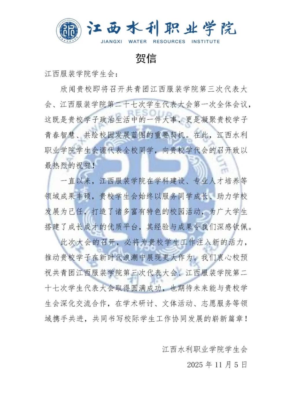 江西水利职业学院学生会向我校发来贺信