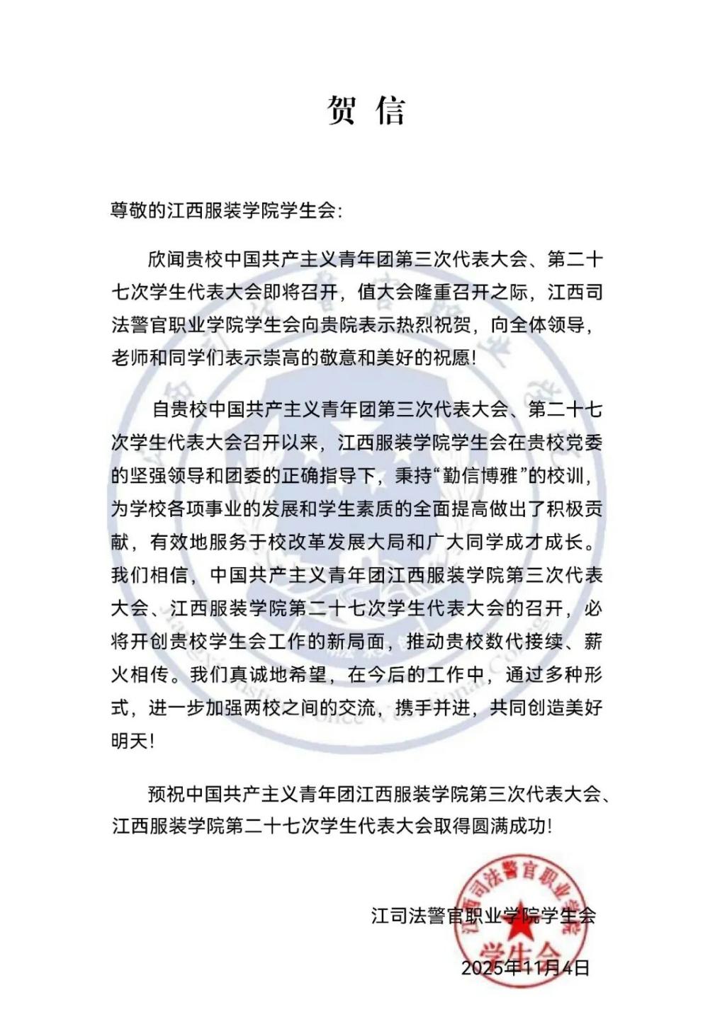 江西司法警官职业学院学生会向我校发来贺信