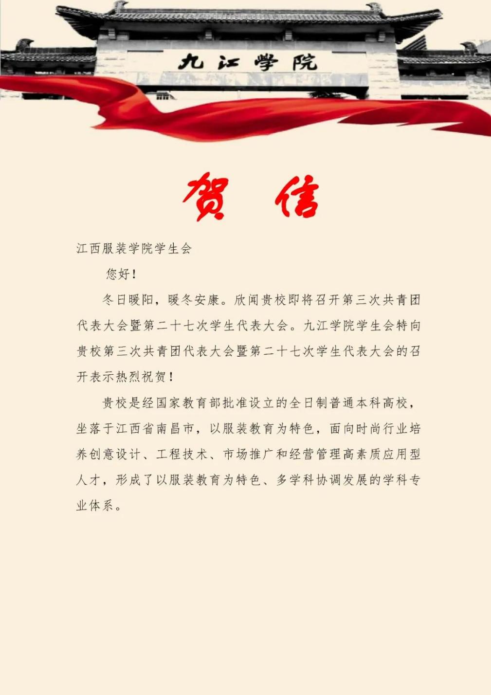 九江学院学生会向我校发来贺信