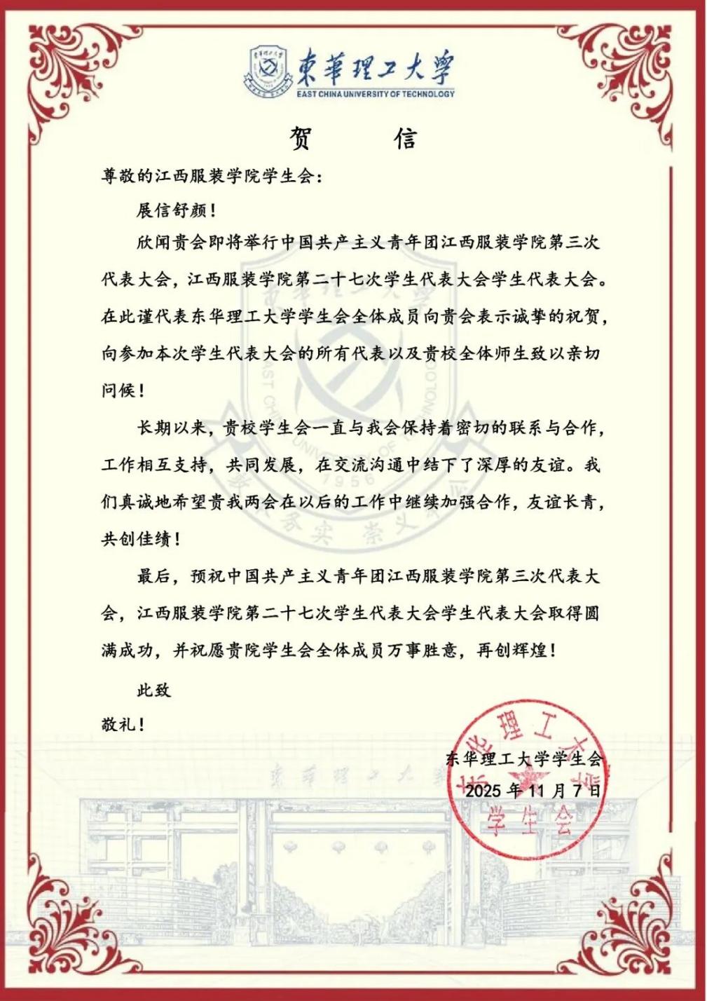 东华理工大学学生会向我校发来贺信