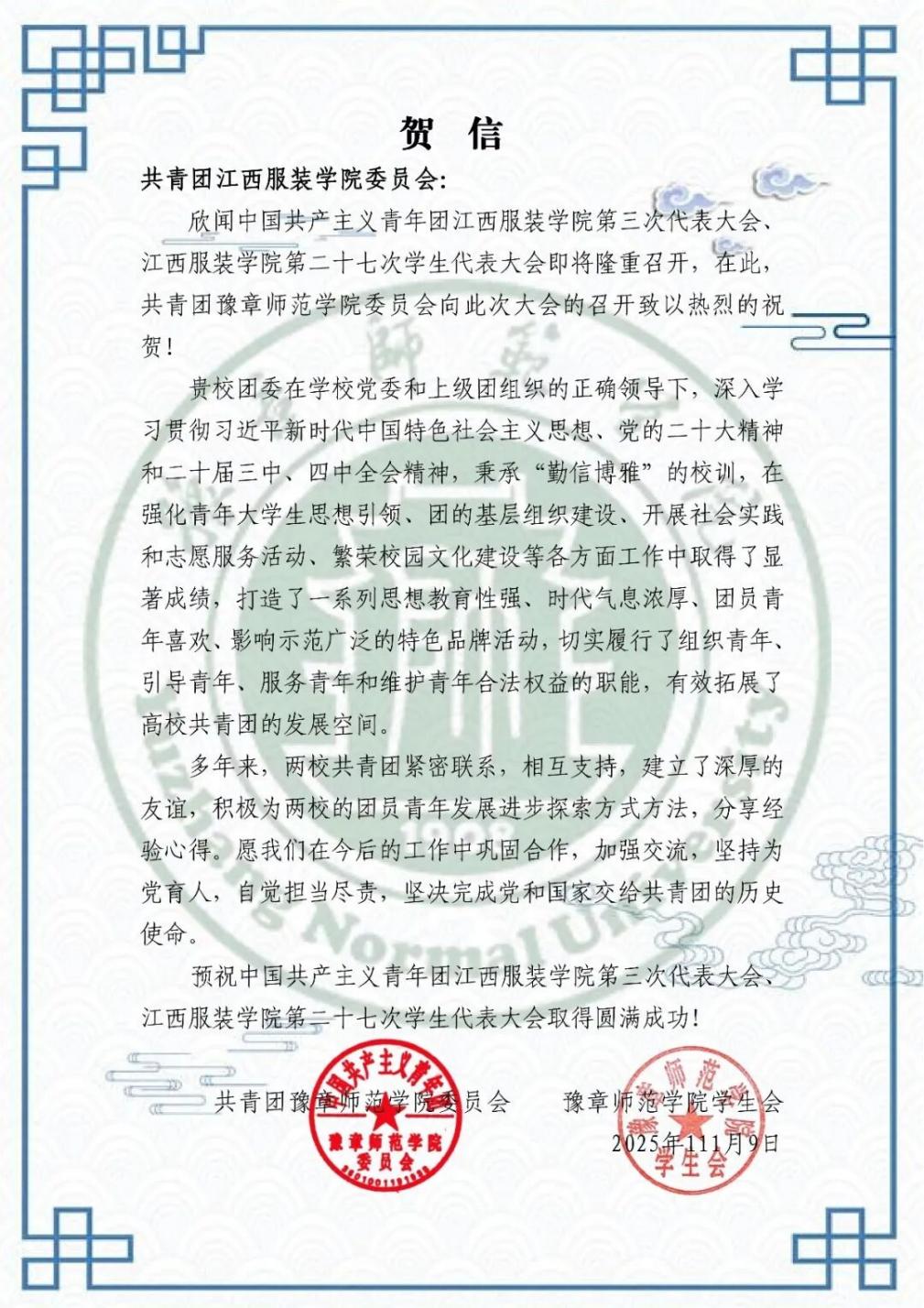 共青团豫章师范学院委员会向我校发来贺信