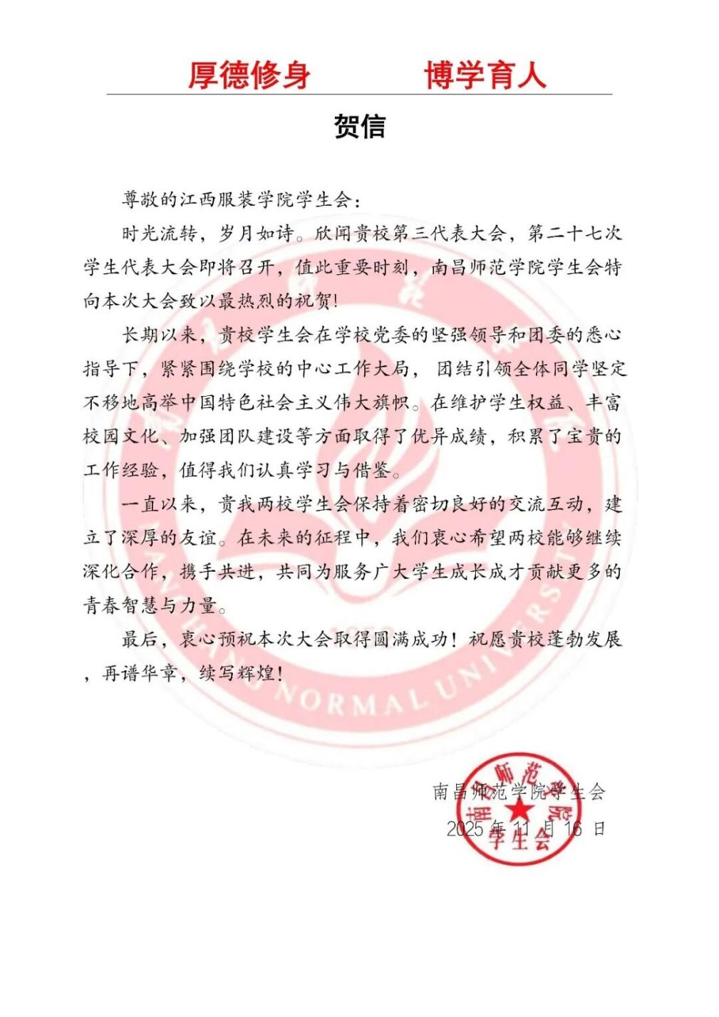 南昌师范学院学生会向我校发来贺信