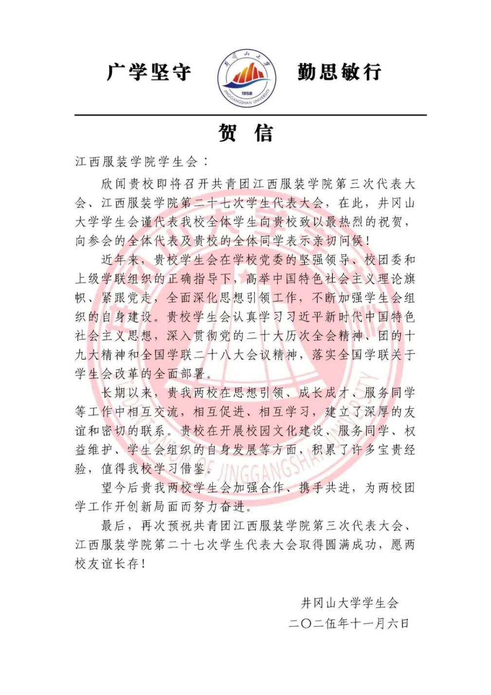 井冈山大学学生会向我校发来贺信
