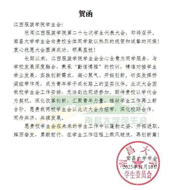南昌大学学生会向我校发来贺信