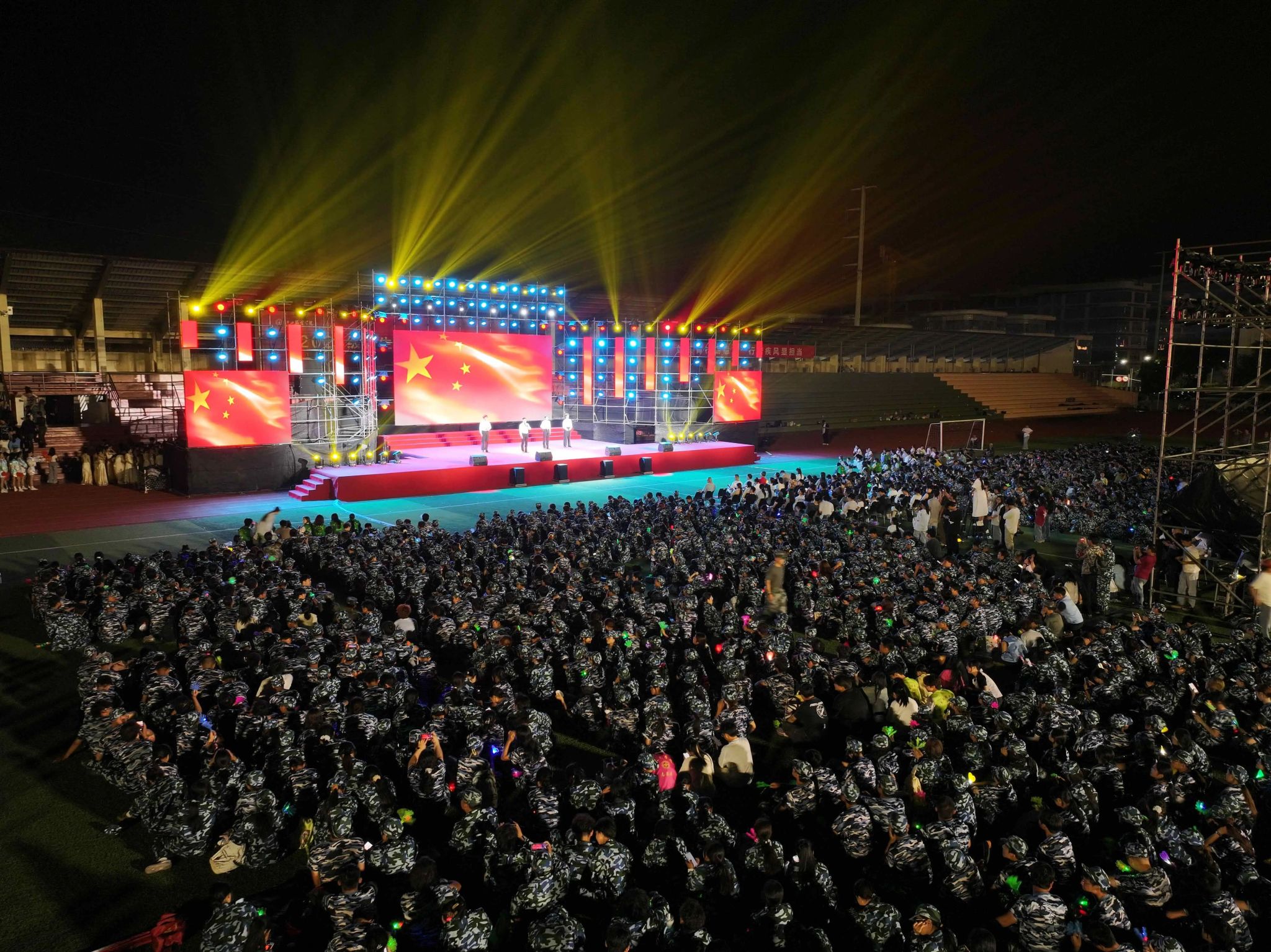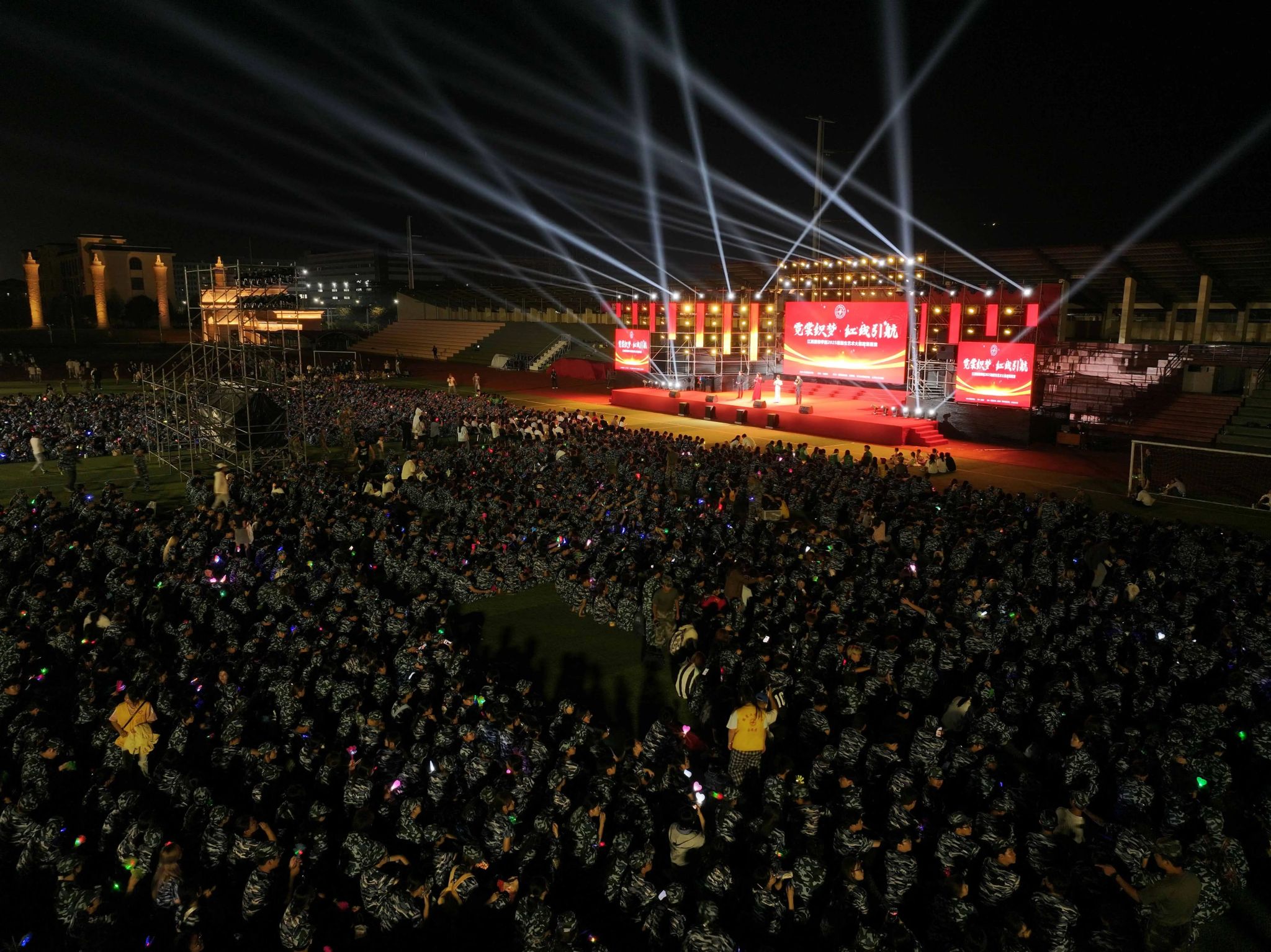秋风送爽霓裳舞,青春向党正当时。10月16日晚,由校团委主办,党委宣传部、人民武装部、军事体育教学部协办的“霓裳织梦 红线引航”2025级新生艺术大思政课展演在田径场精彩上演。校长薛家宝,党委副书记、副校长李宝君,党委副书记唐新强,以及来自各学院、各部门的老师与2025级新生欢聚一堂,共同观看了这场融艺术审美与思政教育于一体的迎新盛宴。