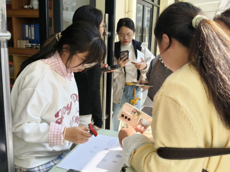 活动现场气氛热烈,不少同学在集章过程中互相交流,拍照留念,记录下青春与文化交织的美好瞬间。洪州窑纹样印章设计精美,承载着悠久的文化底蕴,每一枚印章,都仿佛是一段窑火故事的延续,映照出江服学子对中华传统文化的热爱。