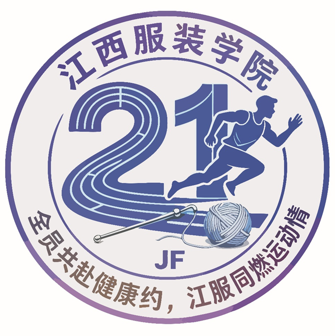 设计理念:本会徽以“服装匠心+运动活力”为核心,紧扣“第二十一届”主题,彰显江服特色与体育精神。整体采用圆形构图,象征团结与圆满。核心视觉元素“21”由田径跑道线条构成,直观体现第21届运动会的赛事属性,跑道的延伸感寓意运动的无限可能与江服学子的奋进姿态。右侧奔跑的运动员剪影,以舒展有力的姿态传递青春朝气与拼搏精神,呼应“全员共赴健康约”的号召。下方的针线与线团元素,是江服办学特色的鲜明符号,代表服装专业的匠心传承,也寓意用一针一线编织梦想、以运动步伐丈量青春的理念。“JF”缩写与“全员共赴健康约,江服同燃运动情”的标语,强化了学校身份与赛事主题,让设计更具辨识度与凝聚力。整体以蓝紫为主色调,兼具活力与典雅,既展现体育竞技的热血,又传递江服人融合专业与运动的独特风貌,完美诠释本届运动会的精神内核。