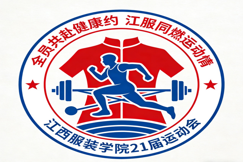 设计理念:本次会徽设计以“服装”与“运动”为核心纽带,紧扣“全员共赴健康约,江服同燃运动情”的主题,将学院特色与体育精神深度融合。会徽中心的红色中式立领服饰,是江西服装学院的专业符号,既彰显了学校深耕服装教育的办学底色,也传递出中式美学与匠心精神。奔跑的蓝色运动员剪影,姿态昂扬有力,象征着学子们在赛场上奋勇拼搏、追逐梦想的朝气;下方的杠铃与壶铃交叉造型,代表力量与耐力的锤炼,呼应了运动会“强健体魄”的初衷,也寓意着江服人在专业与生活中都能扛住压力、突破自我。底部的蓝色水波纹,既暗合江西“赣鄱水乡”的地域特色,也象征着运动精神如流水般生生不息、代代相传。外圈的红蓝配色鲜明醒目,红色代表热血与活力,蓝色彰显理性与专业,两侧的五角星则点缀出团结向上的氛围。整体设计既体现了“以衣载道、以动强身”的理念,也让江服的专业特色与体育精神在视觉上形成了强烈共鸣。