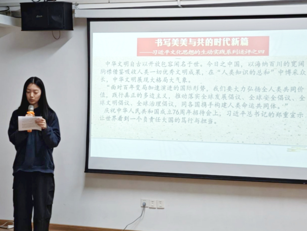 活动以“理论学习+文化科普+实践体验+总结赋能”为主线,层层递进地唤醒青年团员的文化自觉。活动伊始,23服工本科2班团支部书记曾茜带领全体团员共同学习《书写美美与共的时代新篇——习近平文化思想的生动实践系列述评之四》。她围绕“文明交流互鉴”核心要义,结合我国设立“文明对话国际日”、举办中外文化展览等活动,解读了习近平文化思想的实践意义,并立足服装工程专业特色,提出“以专业能力助力文化传承创新”的倡议,鼓励同学们将专业学习与文化自信相融合,为中华文化走向世界贡献青春力量。
