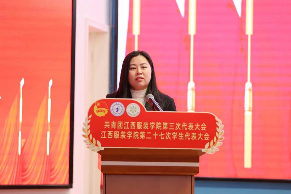 校团委书记孟安然代表共青团江西服装学院第二届委员会作了题为《高举团旗跟党走挺膺担当建新功为建设特色鲜明的高水平应用型大学贡献青春力量》的工作报告。报告回顾了过去五年学校共青团取得的主要成绩和基本经验,客观科学地分析了新形势下的使命与任务,报告指出,未来五年,学校共青团将紧紧围绕学校“十五五”发展战略,实施“思想引领、青春建功、服务提质、文化育人、组织强基”五大工程,并对我校今后五年的共青团工作进行了部署,将持续提升我校共青团的引领力、组织力、服务力和大局贡献度,团结带领广大团员青年在建设特色鲜明的高水平应用型大学的生动实践中书写新的青春华章!经过全体与会代表民主投票,大会选举产生了由19名委员组成的共青团江西服装学院第三届委员会,25名学生委员组成的共青团江西服装学院第二十七届学生委员会。与会代表一致审议通过了《关于共青团江西服装学院第二届委员会工作报告的决议(草案)》和《关于江西服装学院第二十六届学生委员会工作报告的决议(草案)》。大会向全校共青团员和青年学生发出《高举团旗跟党走 挺膺担当建新功 为建成特色鲜明的高水平应用型大学贡献青春力量》的倡议书。