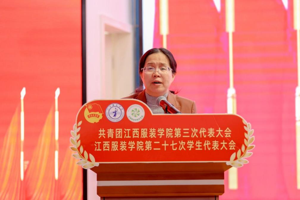 团南昌市委副书记万琪在讲话中向大会的召开致以热烈祝贺,她充分肯定了江西服装学院共青团在思想引领、实践育人、志愿服务和品牌打造等方面取得的亮眼成绩,充分展现了江服青年信念坚定、专业扎实、勇于担当的精神风貌。面向未来,她寄语江服青年:一要以信念为笔,绘就青春底色,要锤炼本领,让青春在与时代同向、与祖国同行中,绽放出鲜明的红色底色;二要以专业为墨,书写成才华章,在服务产业升级与文化传承中展现专业担当,努力成为既能坚守传统根脉、又能引领时尚潮流的专业人才;三要以实践为纸,担当时代使命,让青春在服务南昌发展、助力中国式现代化建设的生动实践中绽放光彩。她表示团市委将一如既往支持学校共青团工作,并希望新一届团委团结带领广大青年为谱写中国式现代化江西篇章贡献青春力量,并预祝大会圆满成功。