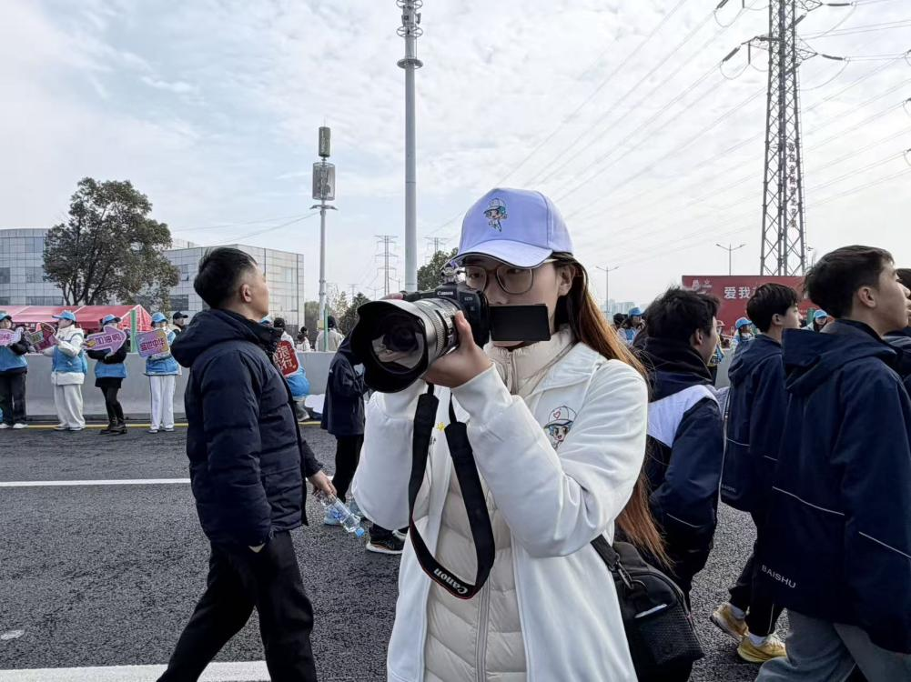 健步活动现场,我用相机记录人群里的精彩瞬间。一会儿定格下呐喊组志愿者挥舞彩旗的热闹模样,一会儿抓拍选手们互相加油鼓劲的暖心画面,就连补给站里递水的双手、拱门旁飘扬的旗帜,都成了我镜头里的珍贵素材。为了捕捉到最鲜活的场景,我跟着队伍跑前跑后,冷风灌进衣领也毫不在意。看着一张张带着温度的照片存进相机,我才真切觉得,自己不只是活动的参与者,更是这份志愿热情的记录者。