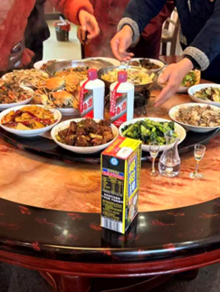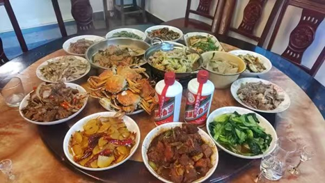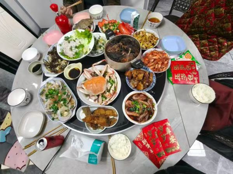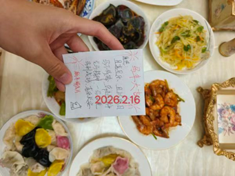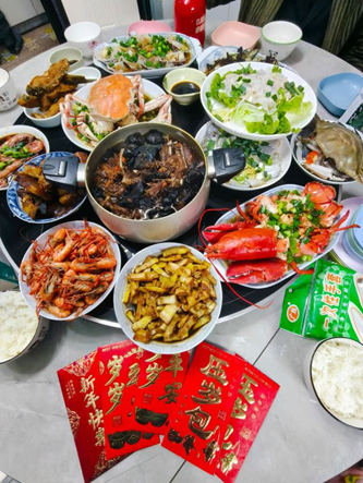 这桌绍兴年夜饭,是由妈妈制作的,既有龙虾、醉蟹、海蟹等鲜活海鲜,更藏着蹄髈炖木耳这样的本地家常风味,搭配清爽的蔬菜,鲜醇与醇厚相融。桌前压岁包、春联红艳夺目,一口海味一口家乡味,满是越地年味。围坐共食间,品的是舌尖鲜醇,暖的是团圆亲情,更期许着马年顺遂安康。