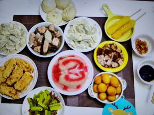 这桌家宴荤素搭配,每道菜都藏着年味。肉包子暄软喷香,肉馅饱满多汁;猪皮肉冻弹韧爽口,蘸醋吃格外解腻。紫薯丸子外酥里糯,甜香浓郁;饺子形似元宝,裹着阖家团圆的期许。甜米做成鱼形,寓意年年有余,软糯清甜。带鱼段炸得金黄酥脆,咸香入味;芹菜炒肉清爽可口,解腻又下饭。排骨炖莲菜软烂脱骨,莲菜脆嫩吸满肉香。芝士棒拉丝绵长,是老少都爱的小食,一桌美味,盛满团圆的幸福。