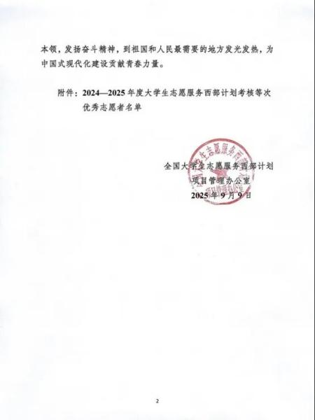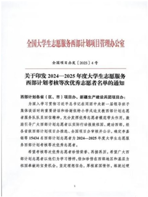 近日,全国大学生志愿服务西部计划项目管理办公室印发《关于印发2024-2025年度大学生志愿服务西部计划考核等次优秀志愿者名单的通知》,其中,我校共11名同学获2024-2025年度大学生志愿服务西部计划“优秀志愿者”。