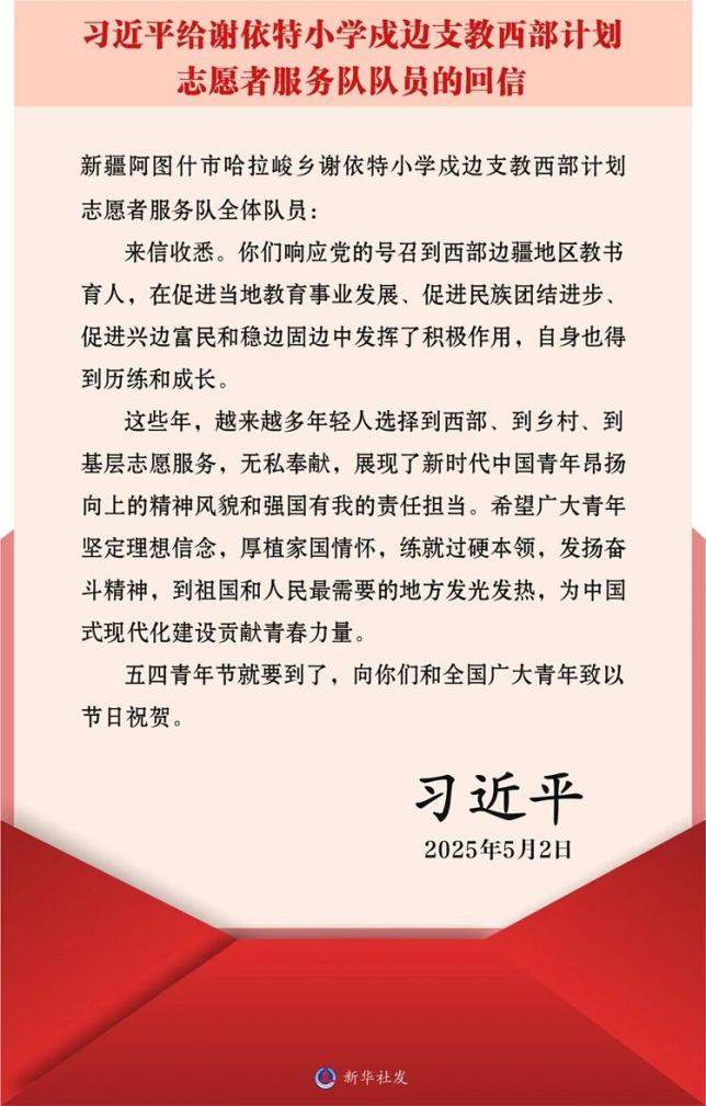 去年“五四”前夕,习近平总书记给新疆谢依特小学戍边支教西部计划志愿者服务队全体队员回信,肯定志愿者响应党的号召到西部边疆地区教书育人,号召广大青年坚定理想信念,厚植家国情怀,练就过硬本领,发扬奋斗精神,到祖国和人民最需要的地方发光发热。
